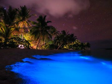 The bioluminescent bay is a shallow lagoon where millions of microscopic organisms called dinoflagellates create an electric-blue shimmer when the water is disturbed.